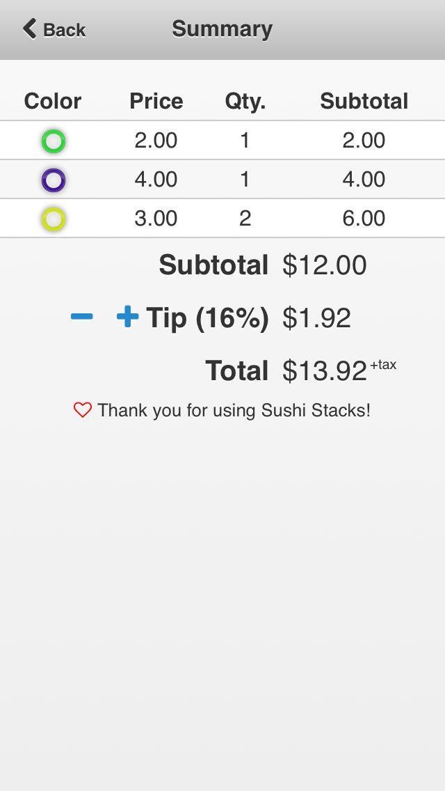 I developed Sushi Stacks as fun way to tally up your meal total made specifically for use at conveyor-belt sushi restaurants.
